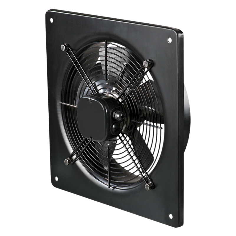 Аксиален вентилатор с ниско налягане, четириполюсен двигател на лагери с външен ротор в стоманен корпус и капацитет до 8800 м3/ч за монтаж на стена.
