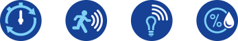 - Таймерът за забавяне на изключването е настроен на 15 минути и винаги се задейства от сензор за движение, осветление или влажност.